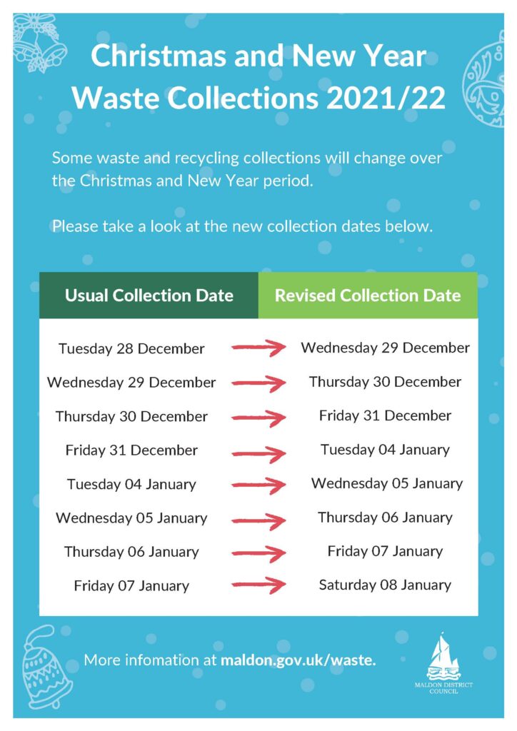 Check your collection day, report a missed collection or request a new bin or recycling container go to the Maldon District Council website.